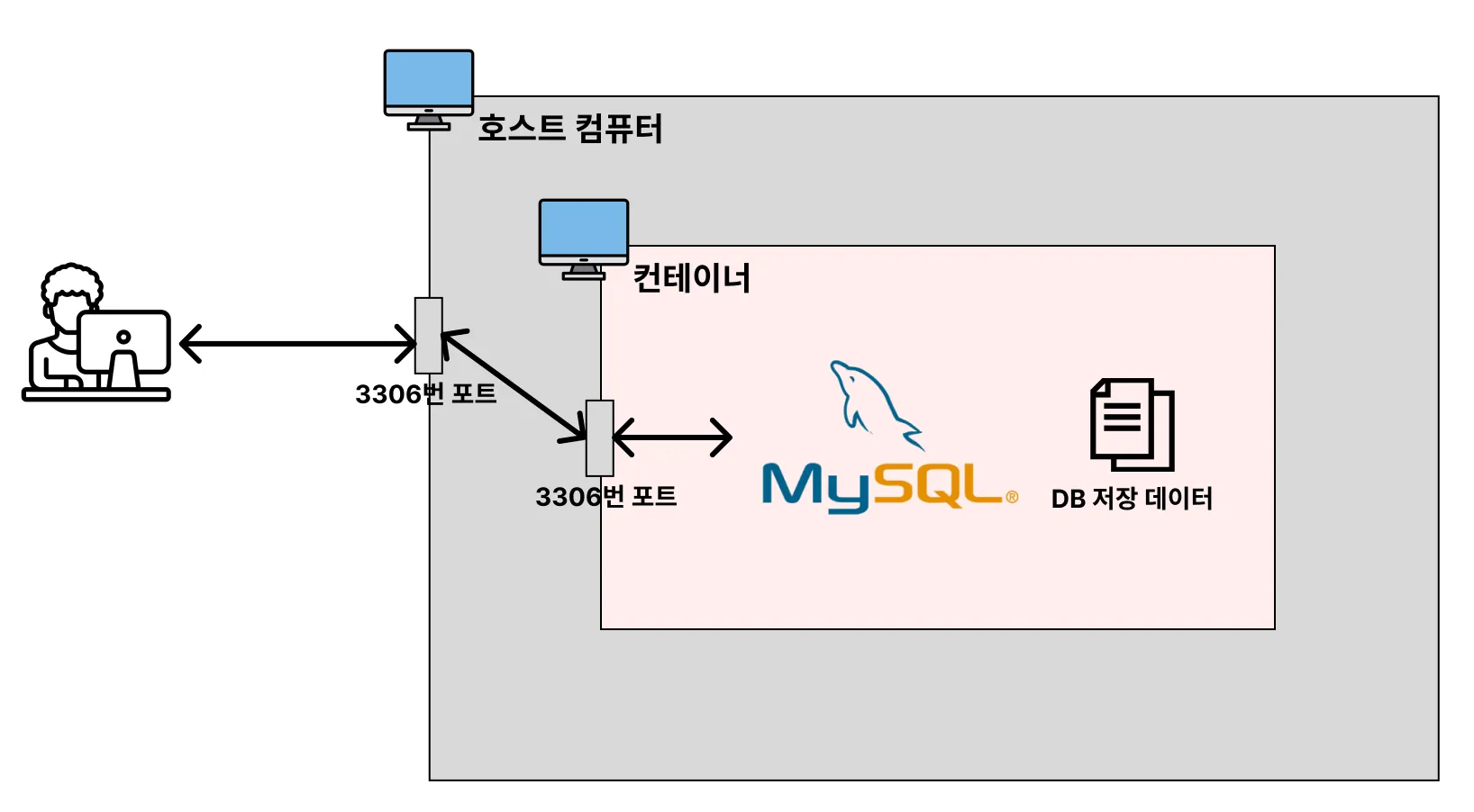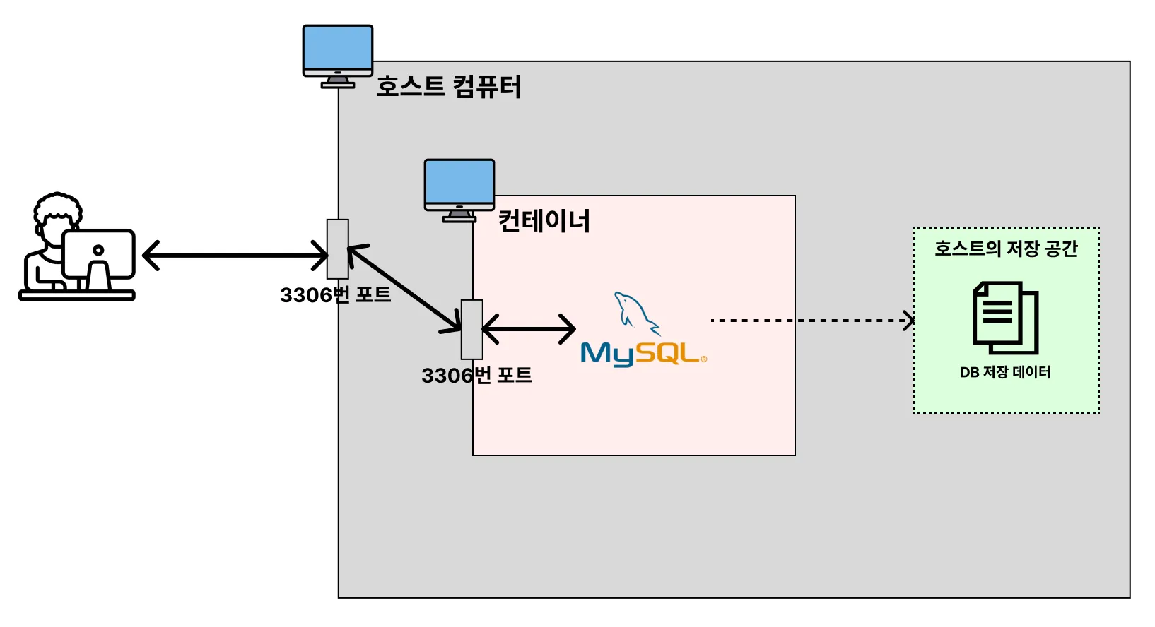 위의 과정은 도커 볼륨을 사용한 것은 아닙니다. 위에서 생성한 MySQL 컨테이너는 컨테이너 내부의 저장 공간을 사용하게 됩니다. 지금까지의 과정을 그림으로 나타내면 다음과 같습니다.