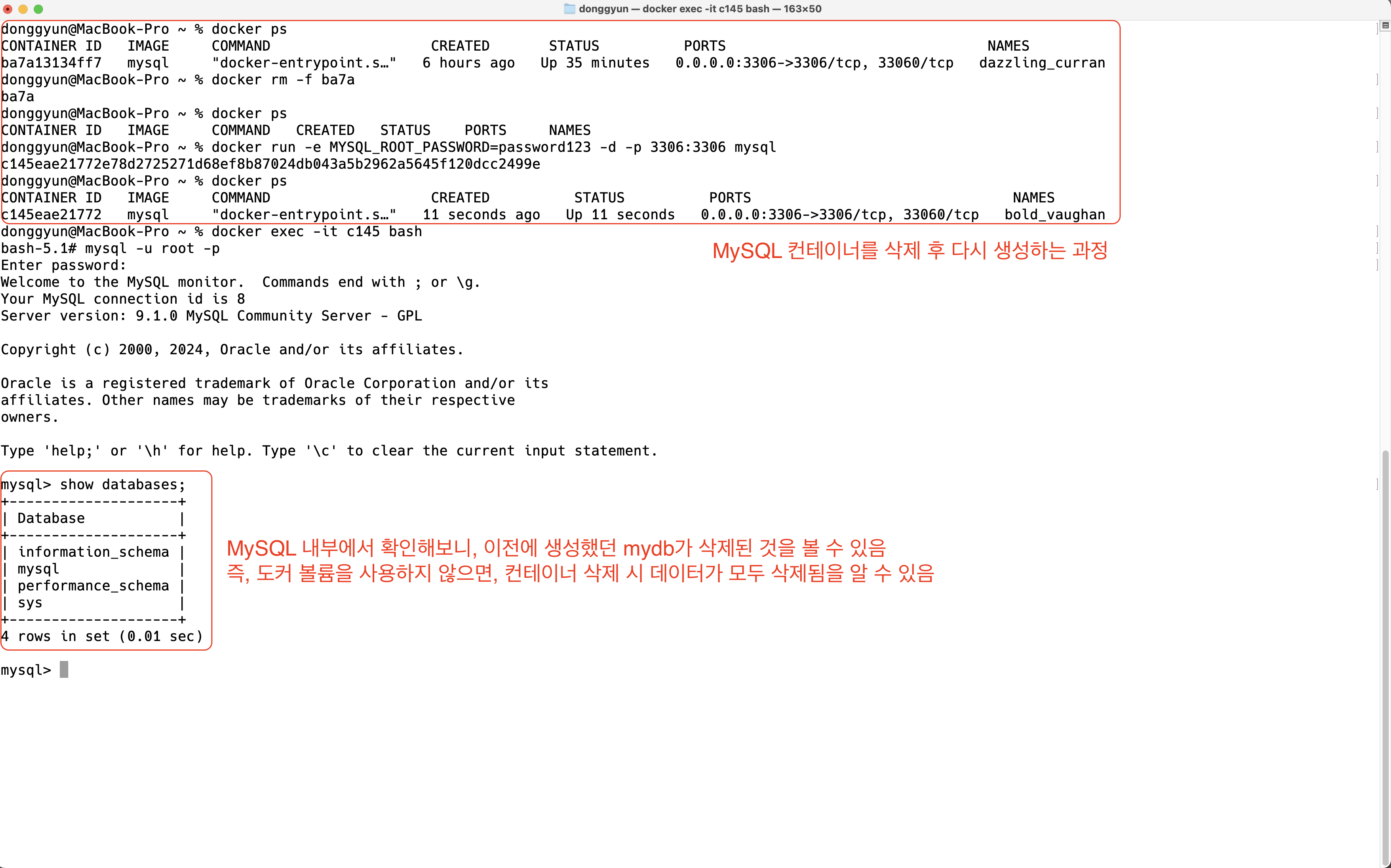위 방식은 볼륨(Volume)을 활용하지 않고 MySQL 컨테이너를 생성하였습니다. 그래서 MySQL 컨테이너를 삭제함과 동시에 MySQL 내부에 저장되어 있던 데이터도 함께 삭제되어 없어졌습니다. 다음에는, 이를 방지하기 위해 볼륨(Volume)을 활용해 MySQL 컨테이너를 띄우는 방식에 대해 알아보도록 하겠습니다.