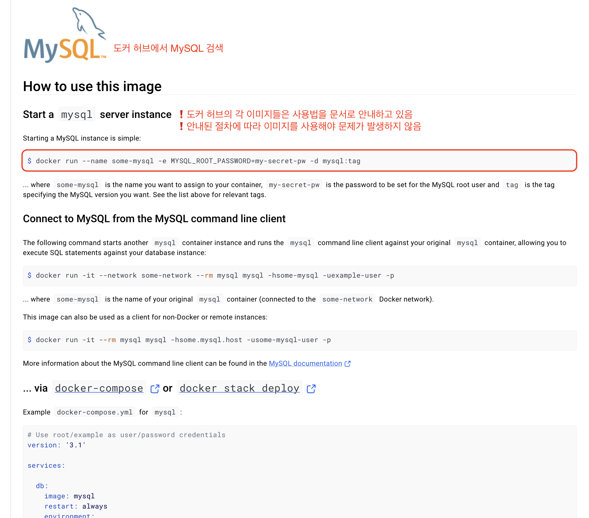 Docker Hub에서 MySQL 이미지를 검색해보면, 다음의 문서를 확인할 수 있습니다.