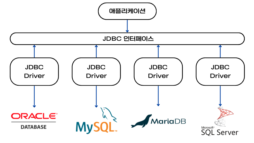 개발자는 인터페이스만 사용하고, 각 DBMS가 제공하는 드라이버가 실제 동작을 수행한다.