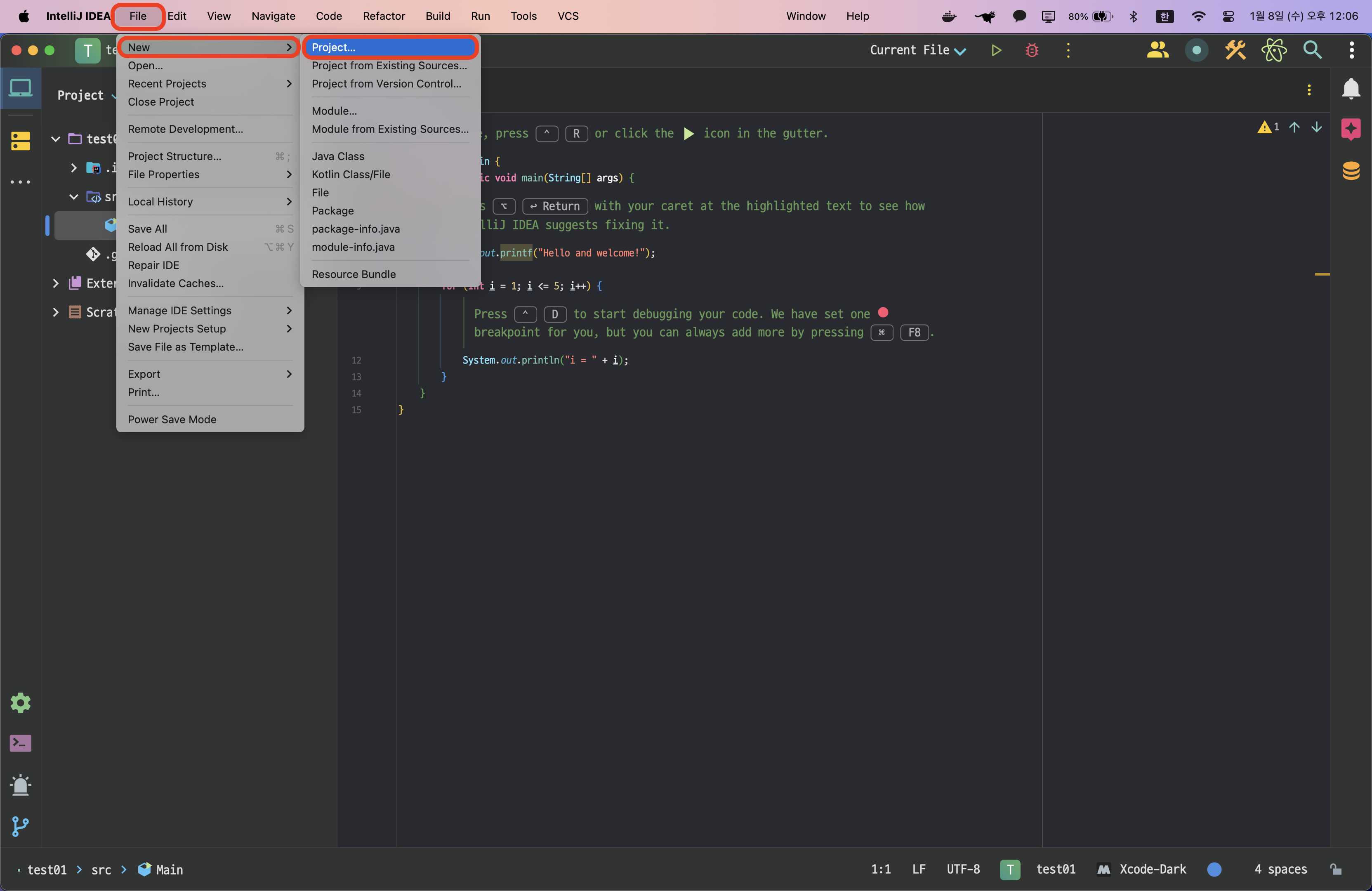 인텔리제이를 실행하고 시작 화면에서 New Project 버튼을 선택합니다. IntelliJ IDEA가 이미 열려있다면, 메뉴에서 File → New → Project...를 선택합니다.