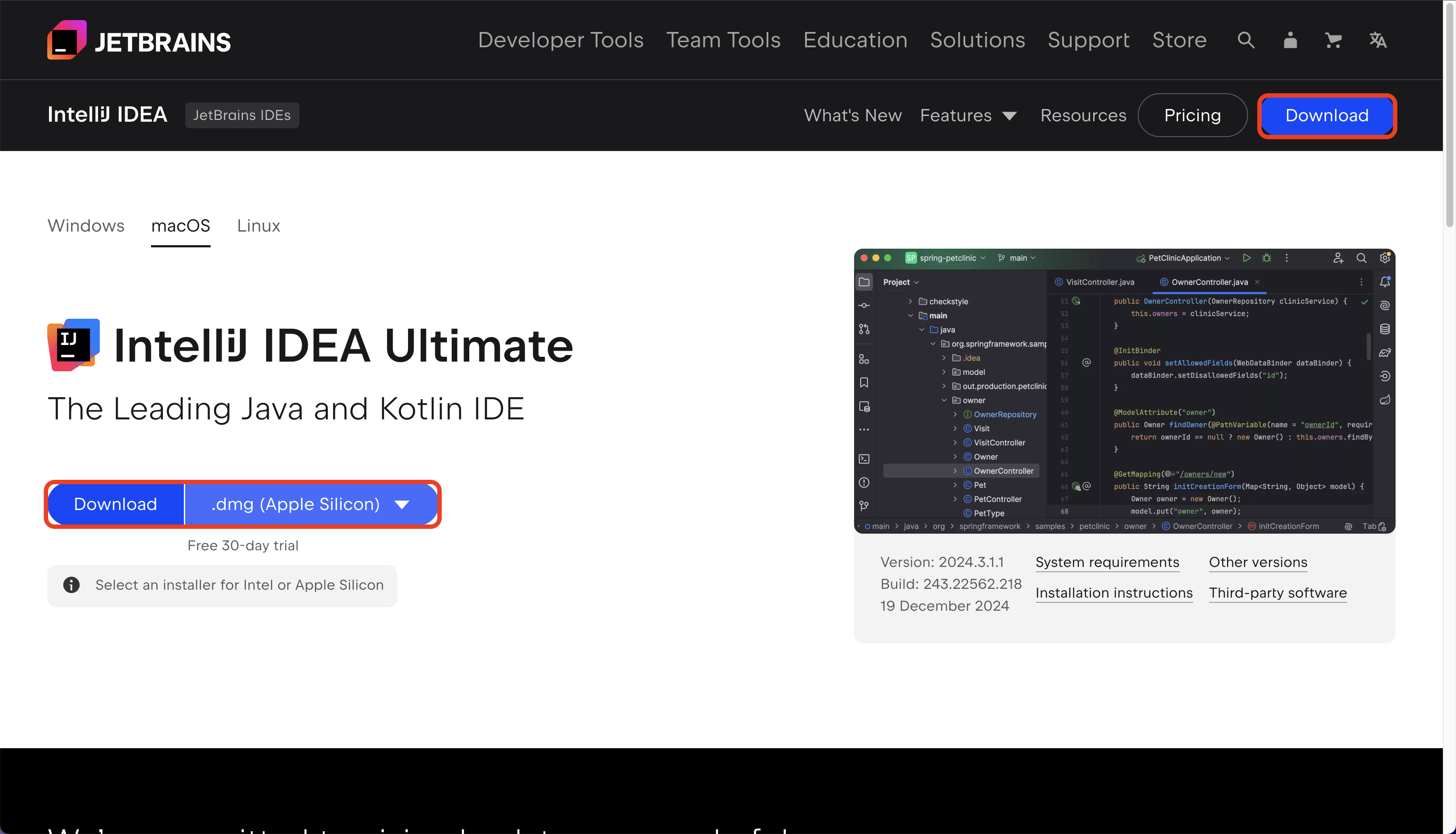인텔리제이 공식 홈페이지에서도 인텔리제이를 다운로드해 설치할 수 있습니다.
