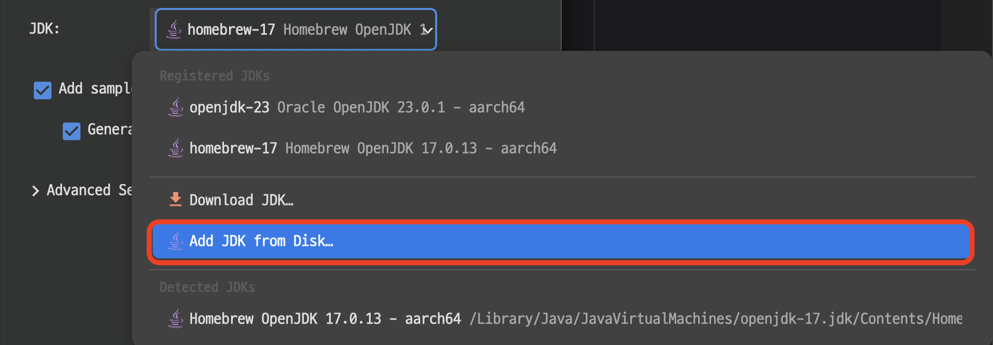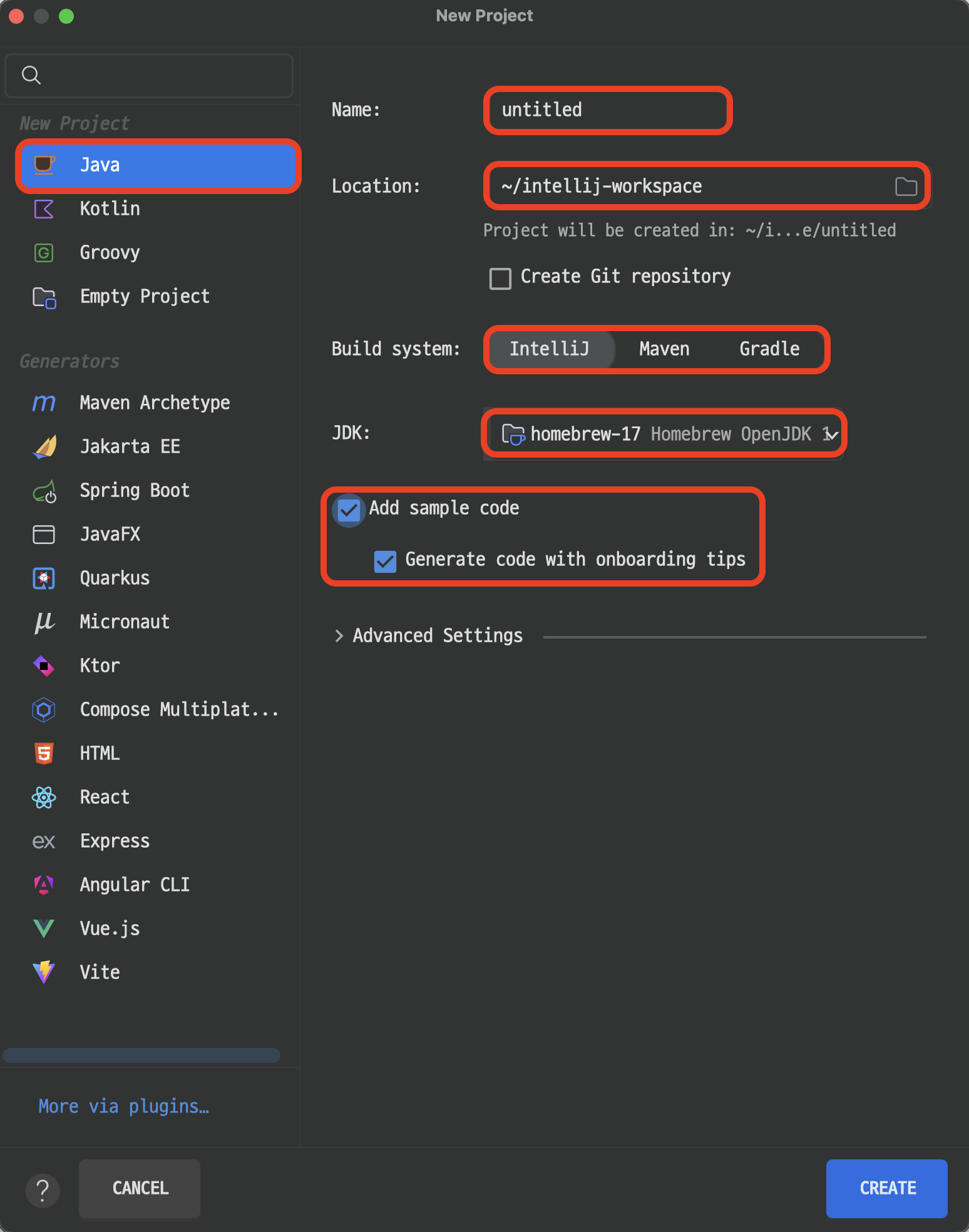 Name 필드에 프로젝트 이름을 입력합니다.Location 필드에 프로젝트를 저장할 경로를 지정합니다.Build System 필드는 IntelliJ를 선택합니다.JDK 필드는 앞에서 설치한 JDK 버전에 맞게 선택합니다. JDK가 설정되어 있지 않다면, Add JDK...를 선택하여 설치한 JDK 경로를 추가합니다.Add sample code 부분은 선택사항입니다.