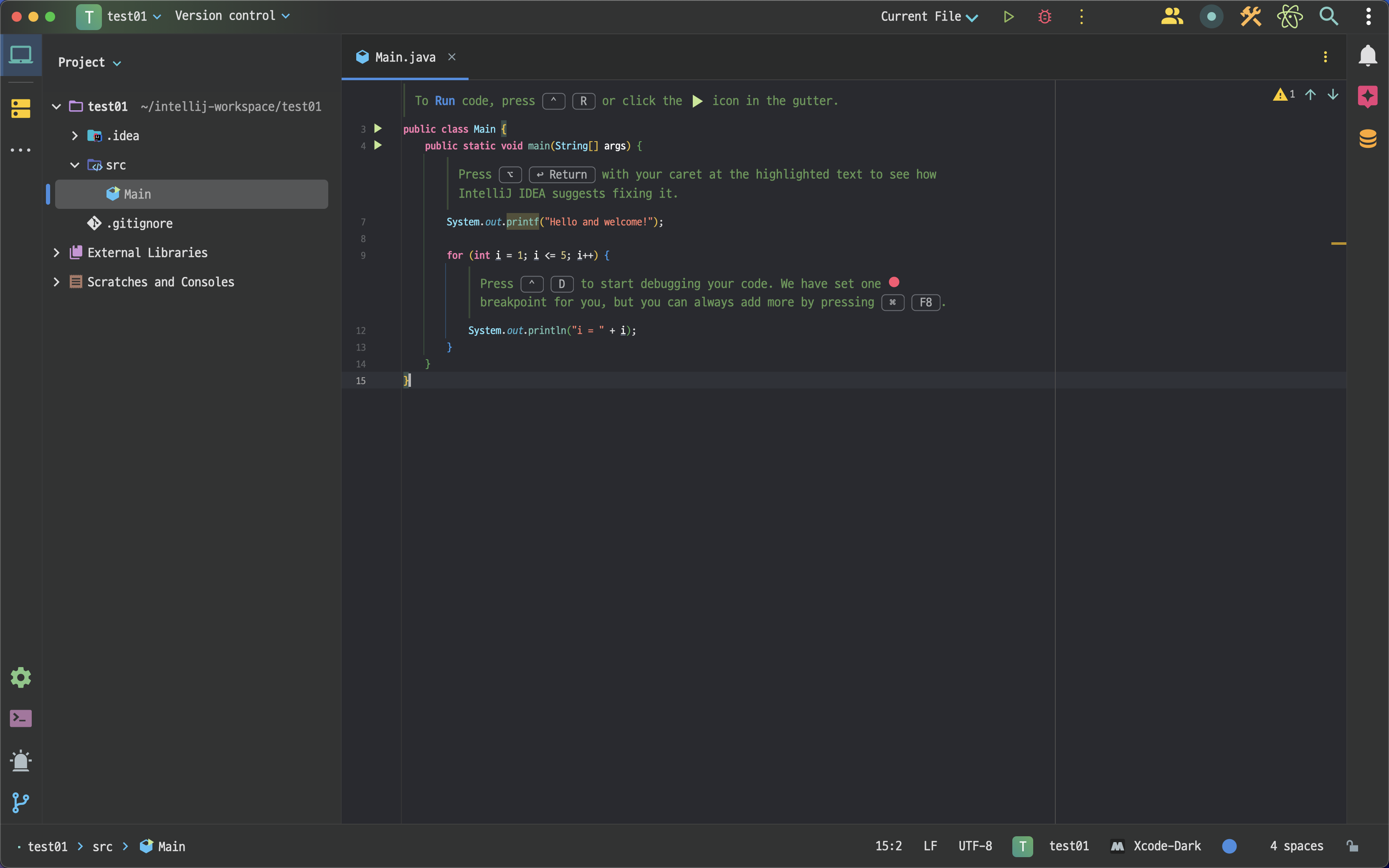 자동으로 입력된 샘플 코드(Main.java)로 자바 소스 코드의 기본 구조를 간단히 살펴보겠습니다.