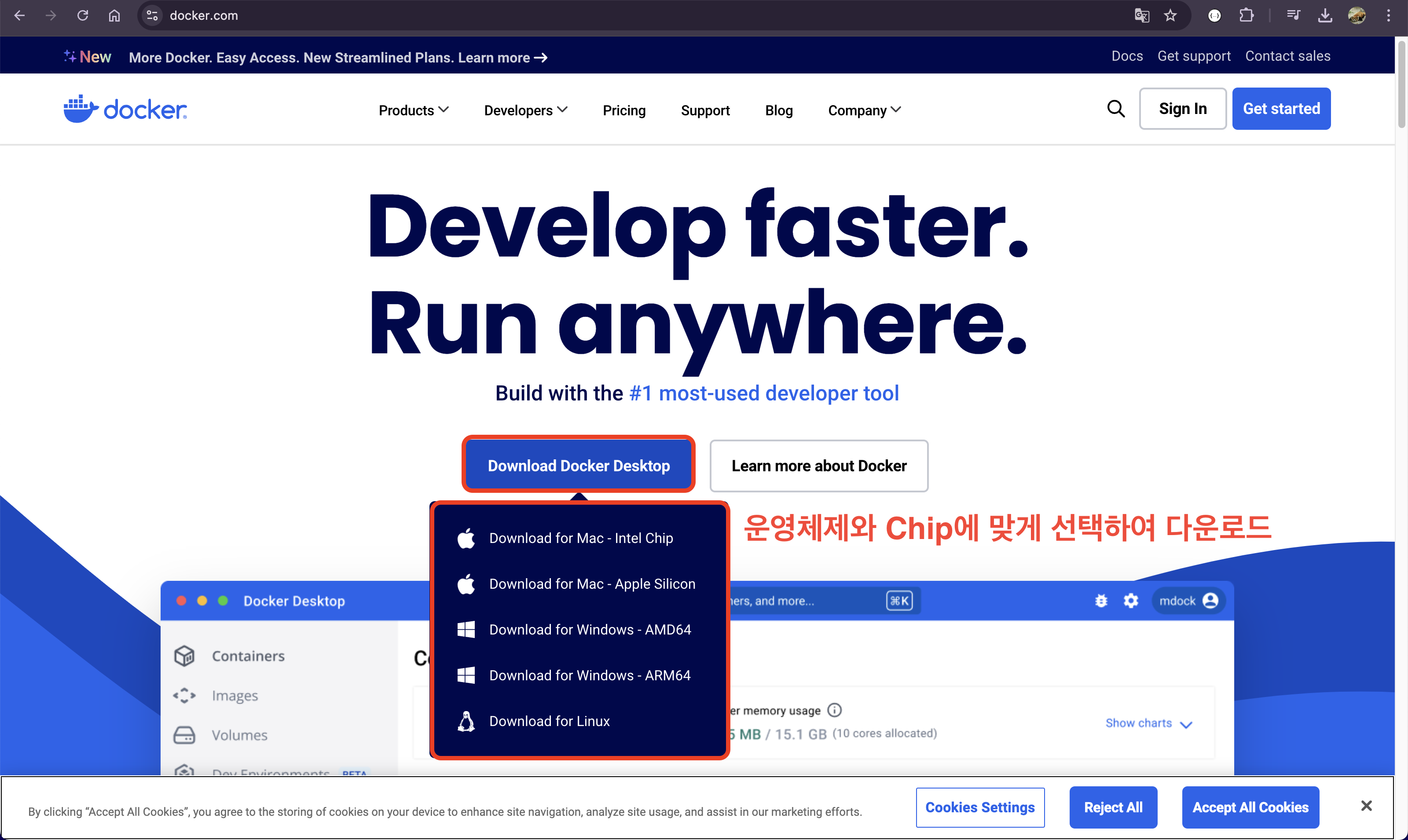 Docker Desktop 링크로 접속하여 Apple Silicon 버전(Apple M 시리즈 칩셋에 해당)을 다운로드 후 설치합니다.