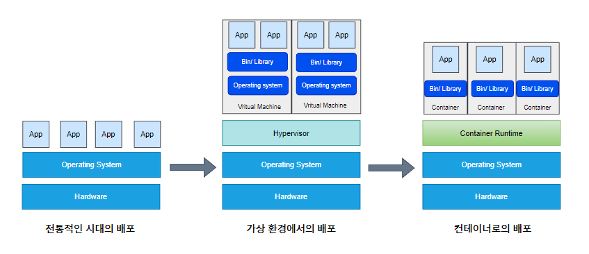 애플리케이션 실행 환경의 변화는 3단계로 나눠집니다. 전통적인 환경에서의 배포(On-Premise)에서 가상 환경에서의 배포(Virtual Machine)로, 또 컨테이너로의 배포(Container)로 이어집니다.