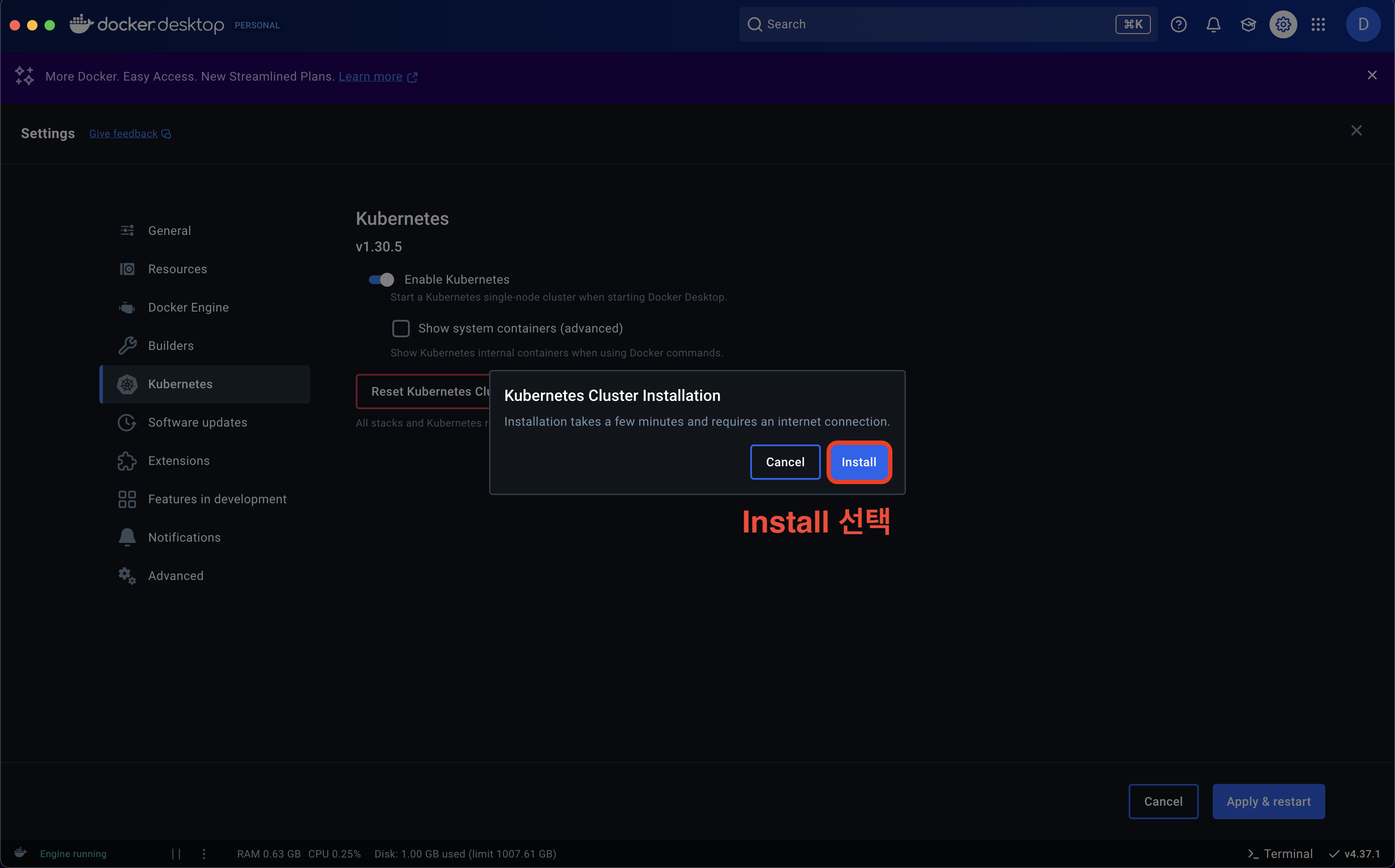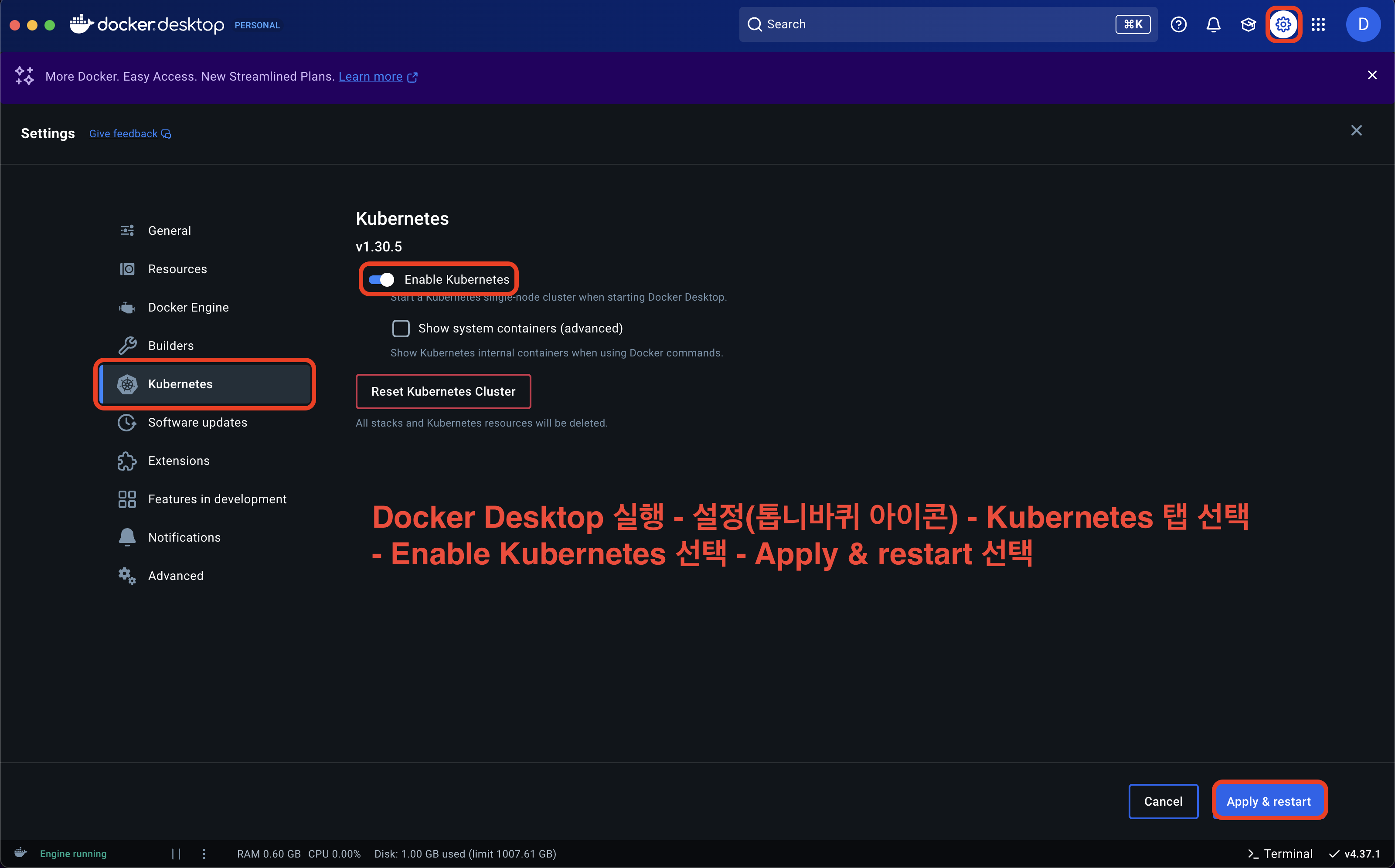 Docker Desktop을 활용하여 쿠버네티스를 설치합니다.