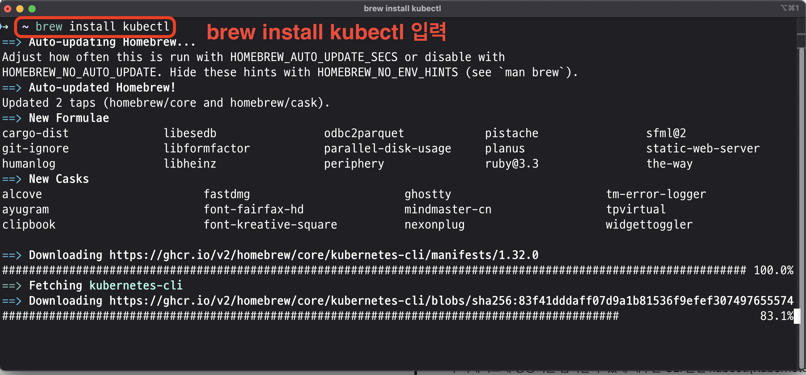 macOS에 kubectl 설치 및 설정 링크를 참고하여, Kubernetes를 관리할 수 있는 CLI 도구 kubectl을 설치합니다. 이 도구를 사용하면 Kubernetes 클러스터를 명령어로 제어할 수 있습니다.
