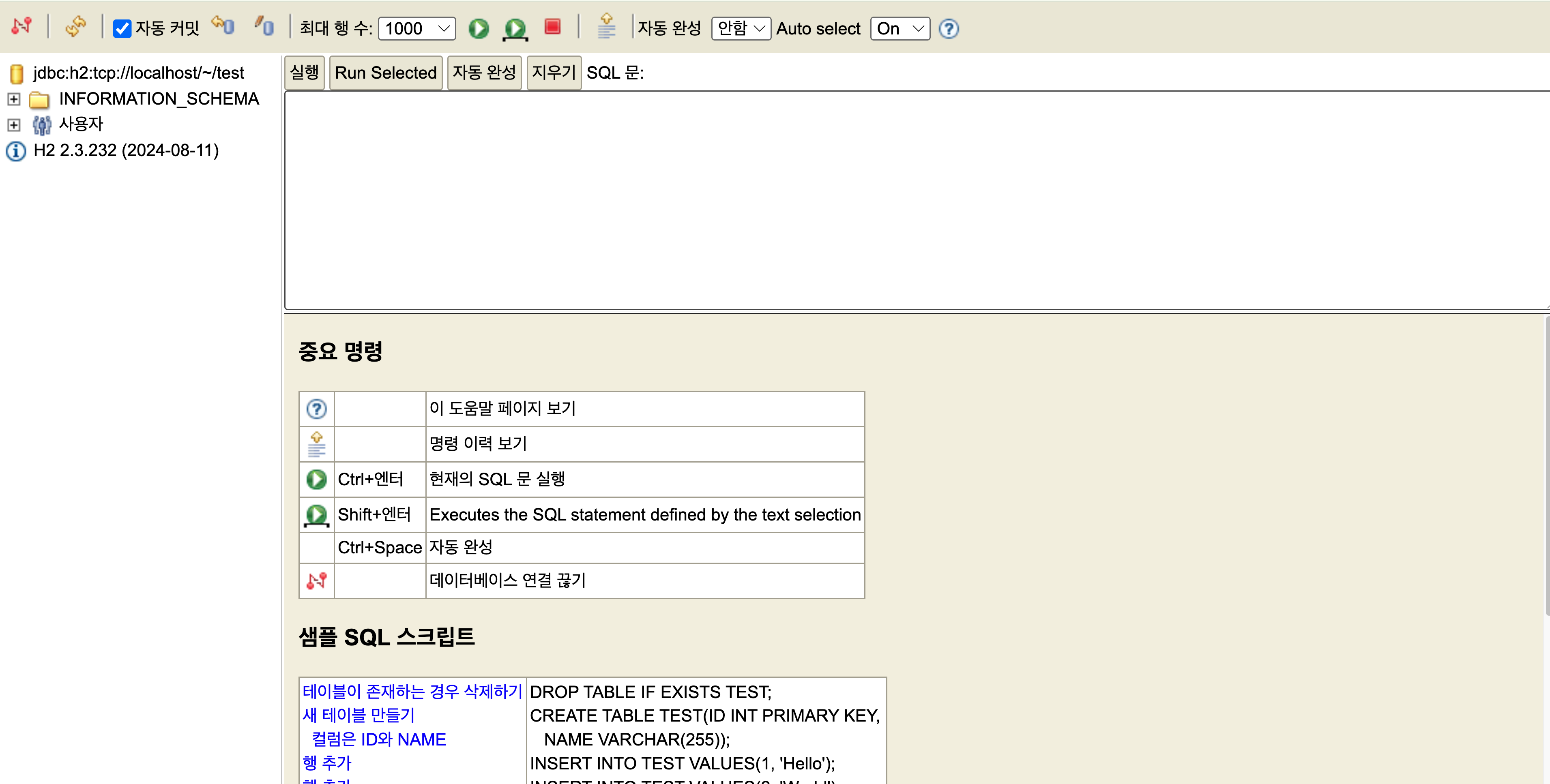 정상적으로 접속되면 아래와 같이 H2 콘솔 화면을 볼 수 있습니다.
