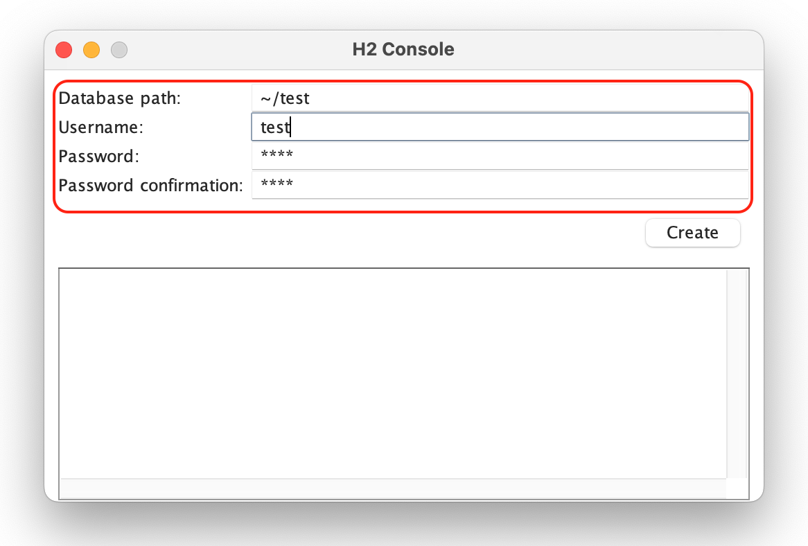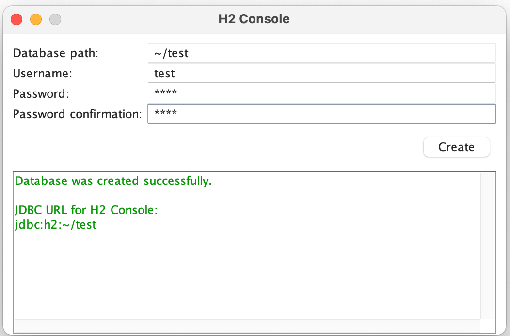 ./test : 현재 H2 실행 파일이 위치한 디렉토리 아래에 test.mv.db 파일이 생성됩니다.~/test : 현재 사용자의 홈 디렉토리 아래에 test.mv.db 파일이 생성됩니다./Users/사용자이름/test.mv.db (Mac), C:\Users\사용자이름\test.mv.db (Windows)Create를 클릭하면 아래와 같은 메시지가 출력됩니다.