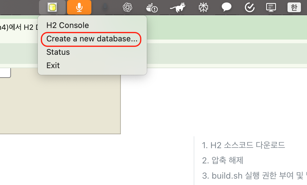 상단바의 H2 Database 아이콘을 클릭한 후, Create a new database...를 선택합니다.