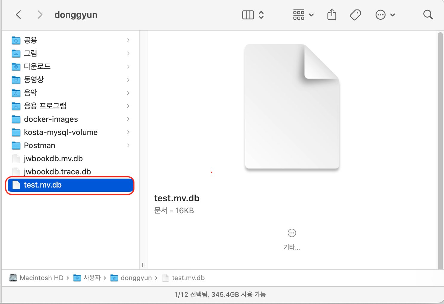 ~/test로 생성한 경우, 홈 디렉토리를 열어보면 다음과 같은 H2 데이터베이스 파일이 존재합니다.