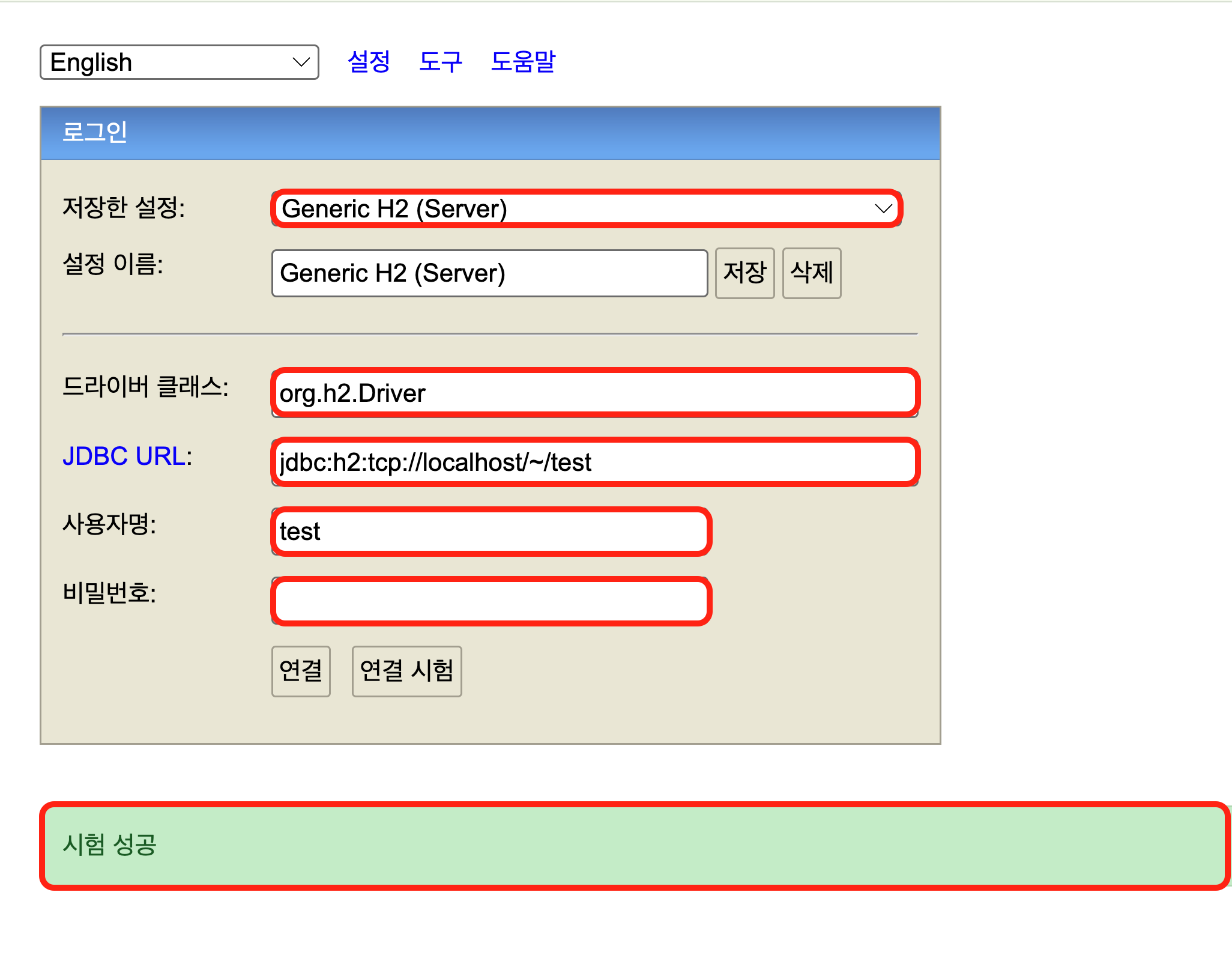 다시 H2 콘솔 화면에서 생성한 사용자 정보와 DB 경로를 입력한 뒤 접속합니다.