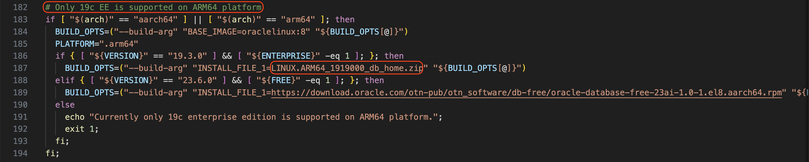 unzip → 설치 → 설정하는 과정이 자동으로 수행됩니다.buildContainerImage.sh 스크립트 파일 내용을 보면, ARM64 플랫폼(예: M1/M2 Mac)에서는 다음과 같이 19c EE 버전만 빌드 가능하도록 제한되어 있습니다