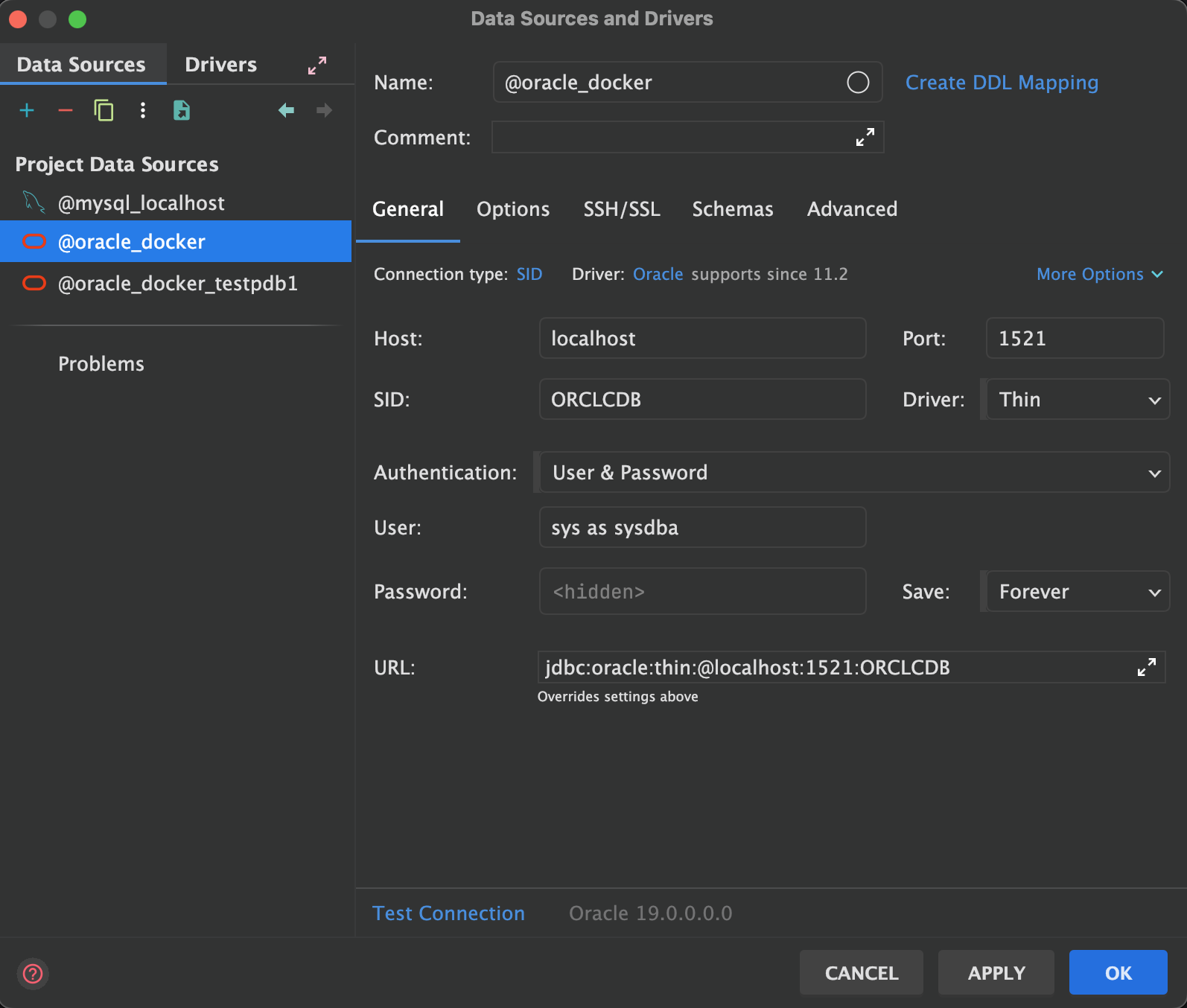 DataGrip에서는 SID 방식 또는 Service Name 방식으로 접속 설정을 선택할 수 있습니다.
