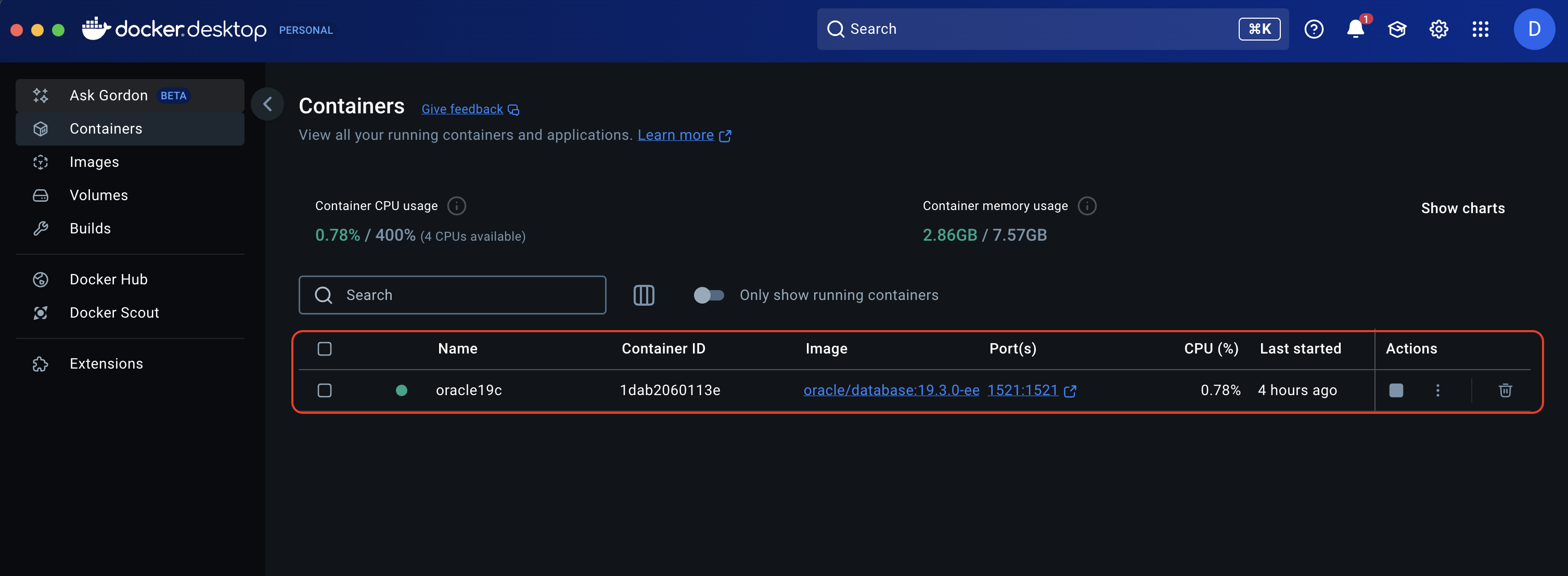-d oracle/database:19.3.0-eedocker run--name oracle19c-p 1521:1521-e ORACLE_PWD=oracle-doracle/database:19.3.0-ee도커 허브에서 컨테이너가 잘 생성/실행되었는지 확인해 보겠습니다.