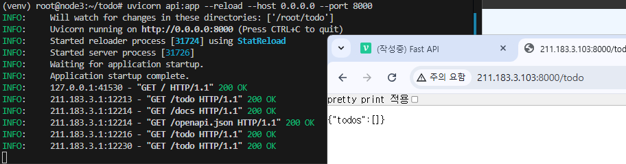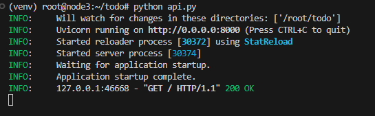 (venv) root@node3:~/todo# uvicorn api:app --host 0.0.0.0 --port 8000 --reload