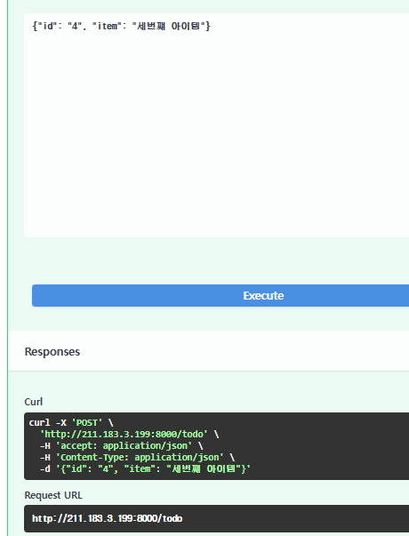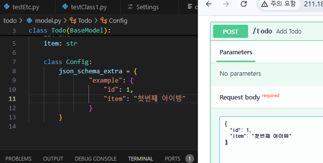 현재의 todo 라우트에는 스키마 모델이 생략되어 있어 마음대로 딕셔너리 값을 전달할 수 있다. (아무 데이터나 입력 가능)