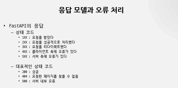 리소스 식별: 경로 매개변수는 API 라우팅에서 특정 리소스를 식별하기 위해 사용됩니다. 예를 들어, todo_id를 통해 특정 todo 항목을 식별할 수 있습니다.