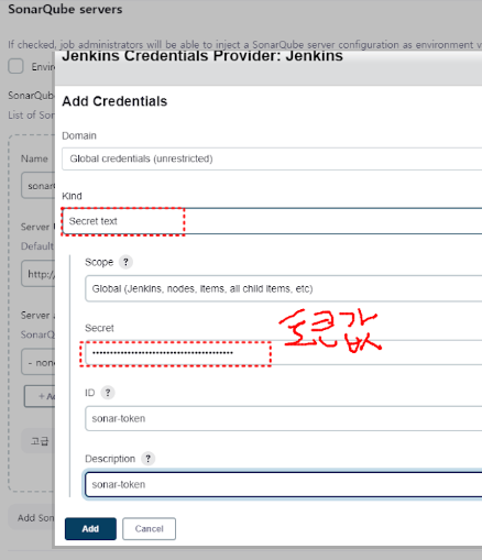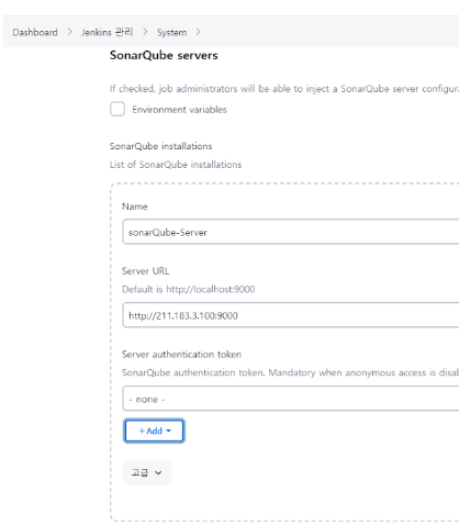 대시보드 > Jenkins 관리 > System 에서 SonarQube servers 항목으로 들어간 뒤, 아래와 같이 소나큐브의 서버정보를 등록한다. 이름과 주소는 이후 파이프라인을 동작시킬 때 사용하므로 별도로 복사해 둔다. 토큰은 서버 등록 이후 다시 돌아와서 등록할 수 있으므로 일단 이름, 주소만 등록하고 저장한다.