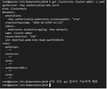 즉, root 사용자에게는 클러스터 전체를 관리할 수 있는 cluster-admin 역할이 부여되어, 클러스터에서 다양한 명령어를 실행할 수 있는 권한이 주어집니다.