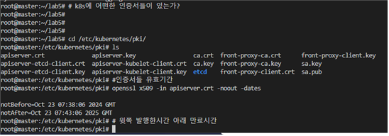 ls 내용에는 각 파일들은 Kubernetes 구성 요소에 대한 인증서들입니다. 대부분의 인증서는 1년의 만료기간을 가지며, 적절한 시기에 갱신이 필요합니다. kubeadm으로 생성된 인증서들은 재발급이 가능하며, 만료 기간이 긴 인증서를 받기 위해서는 OpenShift와 같은 플랫폼 또는 하드웨어 보안 모듈(HSM)을 활용한 방법을 고려할 수 있습니다.