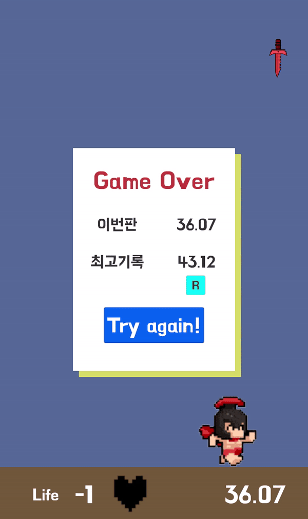 3) 최고기록 시간 아래 R 버튼 : ResetScore 버튼. 이번판 점수로 최고기록 설정. ResetScoreBtn에서 PlayerPrefs의 데이터를 모두 지우면 기록을 저장하는 로직이 GameManager의 Update에서 실행되기 때문에 현재 점수가 최고기록으로 저장된다.