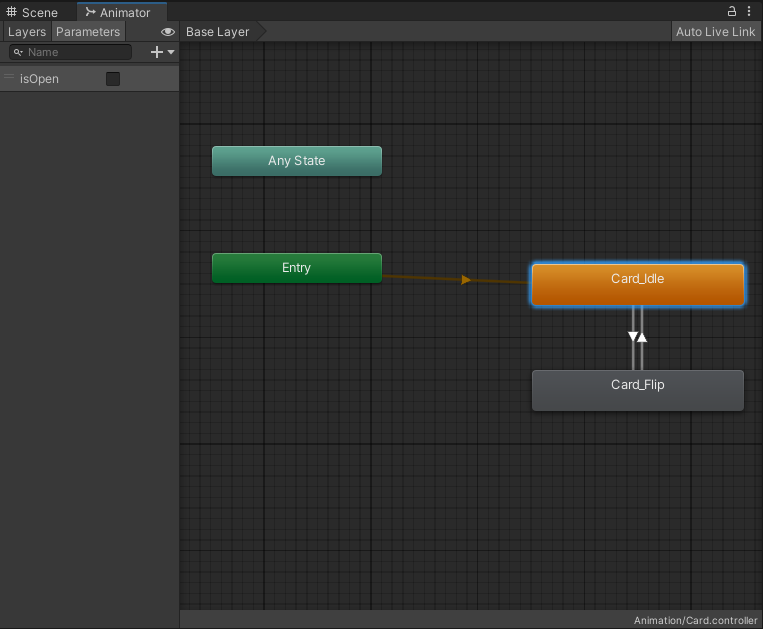 Card Animator에서 bool Parameter "isOpen"을 추가하여 isOpen값이 true가 될 때 기본 상태의 Card_Idle animation에서 Card_Flip으로 넘어가는 Transition과 isOpen값이 false가 될 때 Card_Flip에서 Card_Idle로 넘어가는 Transition을 만든다.
