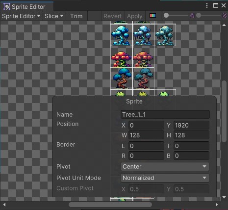 모든 나무 Sprite의 Pivot을 ButtomCenter로 설정하면 나무 오브젝트의 position을 건드리지 않고 정확히 위치시킬 수 있다.