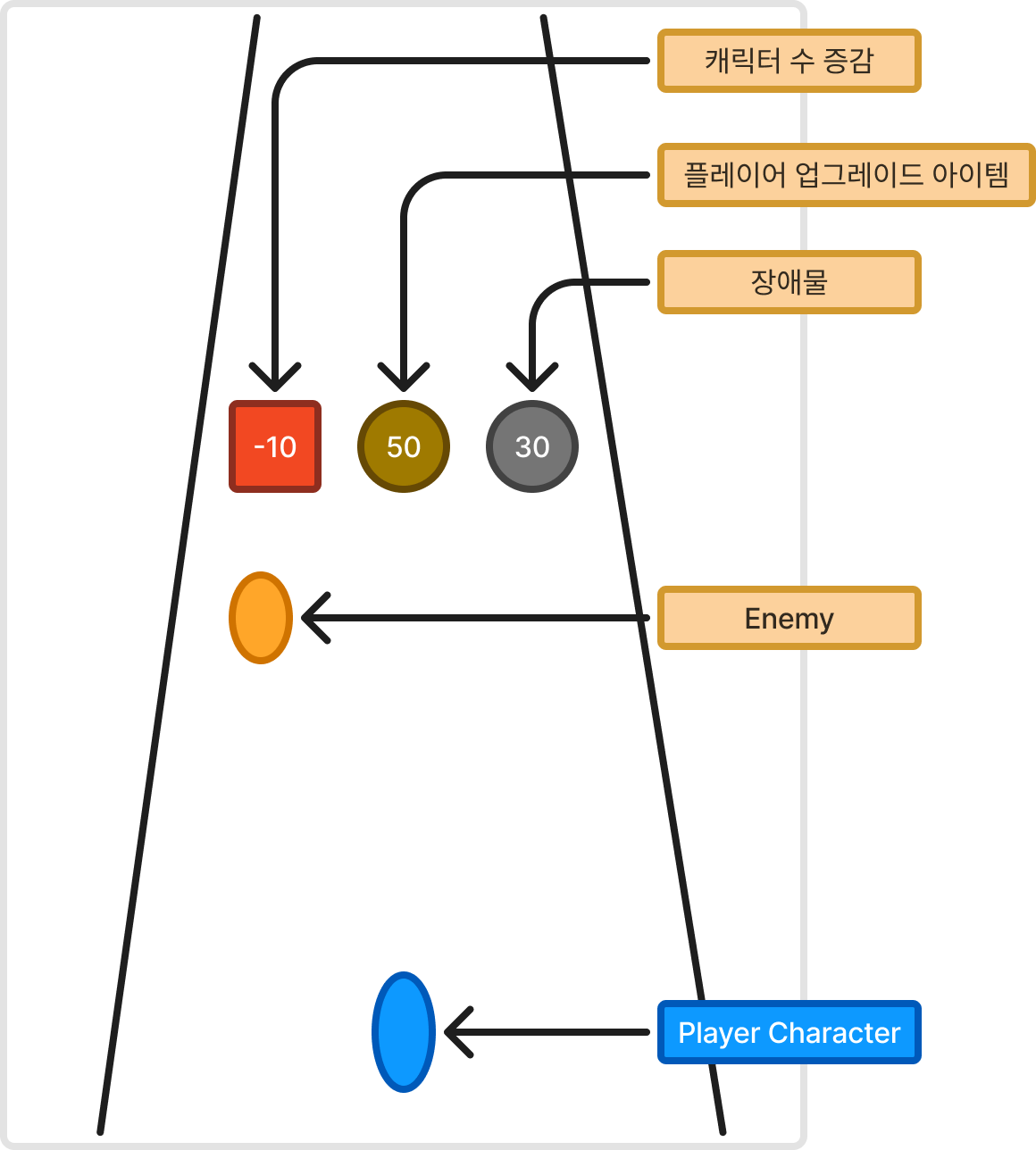 캐릭터 수 증감, 플레이어 업그레이드 아이템, 장애물을 맡아 구현하기로 했다.