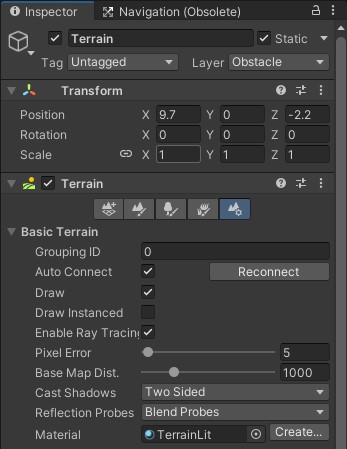 위 현상을 해결하기 위해 Inspector창에서 Terrain - Terrain 설정 - BasicTerrain - Reflection Probes를 off로 설정했지만 안드로이드 빌드 시 같은 현상이 지속되었다