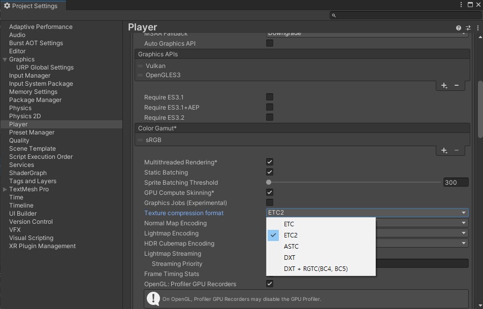 유니티 에디터 상단의 File > Build Settings > Player Settings(Project Setting - Player) > Android 선택 > Other Settings > Texture Compression Format > ETC2로 설정 (아래의 [Image 2] 참고)