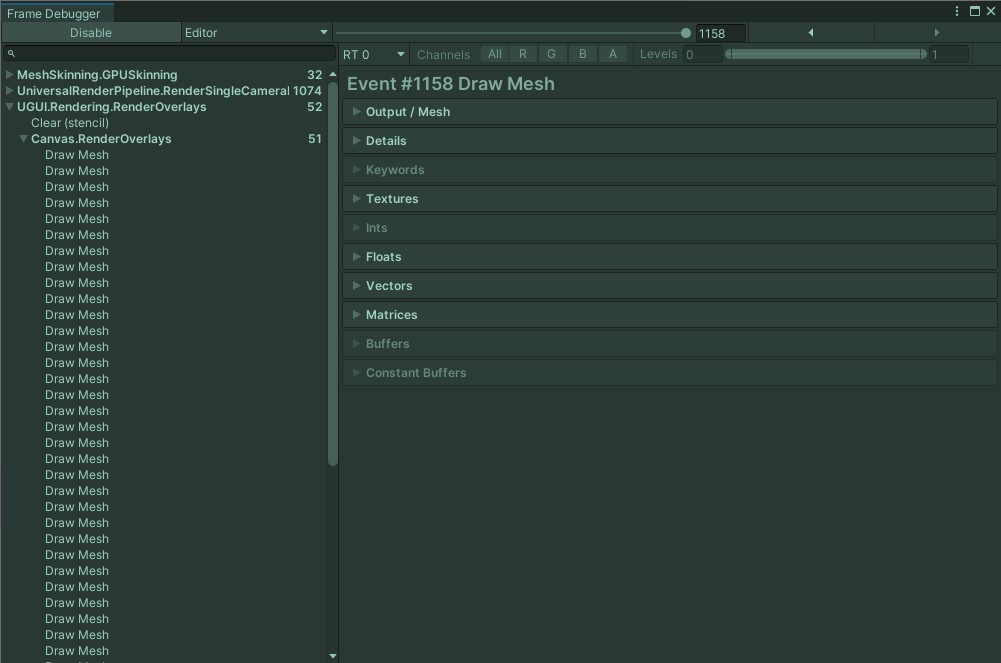 아직 작업중이라 최적화되어 있진 않지만 그래도 아래의 [Image 3 ~ 6]처럼 DrawCall이 줄어든 것을 확인할 수 있다.