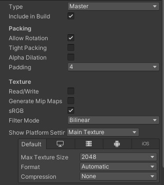 위의 [Image 1]과 같이 Inspector 창에서 Objects For Packing에 Image를 추가하여 하나의 텍스처로 Packing 할 수 있다. 아래의 [Image 2]에서 Tight Packing을 사용하면 해당 스프라이트의 아웃라인에 따라 패킹하여 밀도를 극대화할 수 있지만, 이런 경우 스프라이트가 깨질 수 있기 때문에 주의하여 사용해야 한다. 해제하면 기본 직사각형의 아웃라인으로 패킹된다.