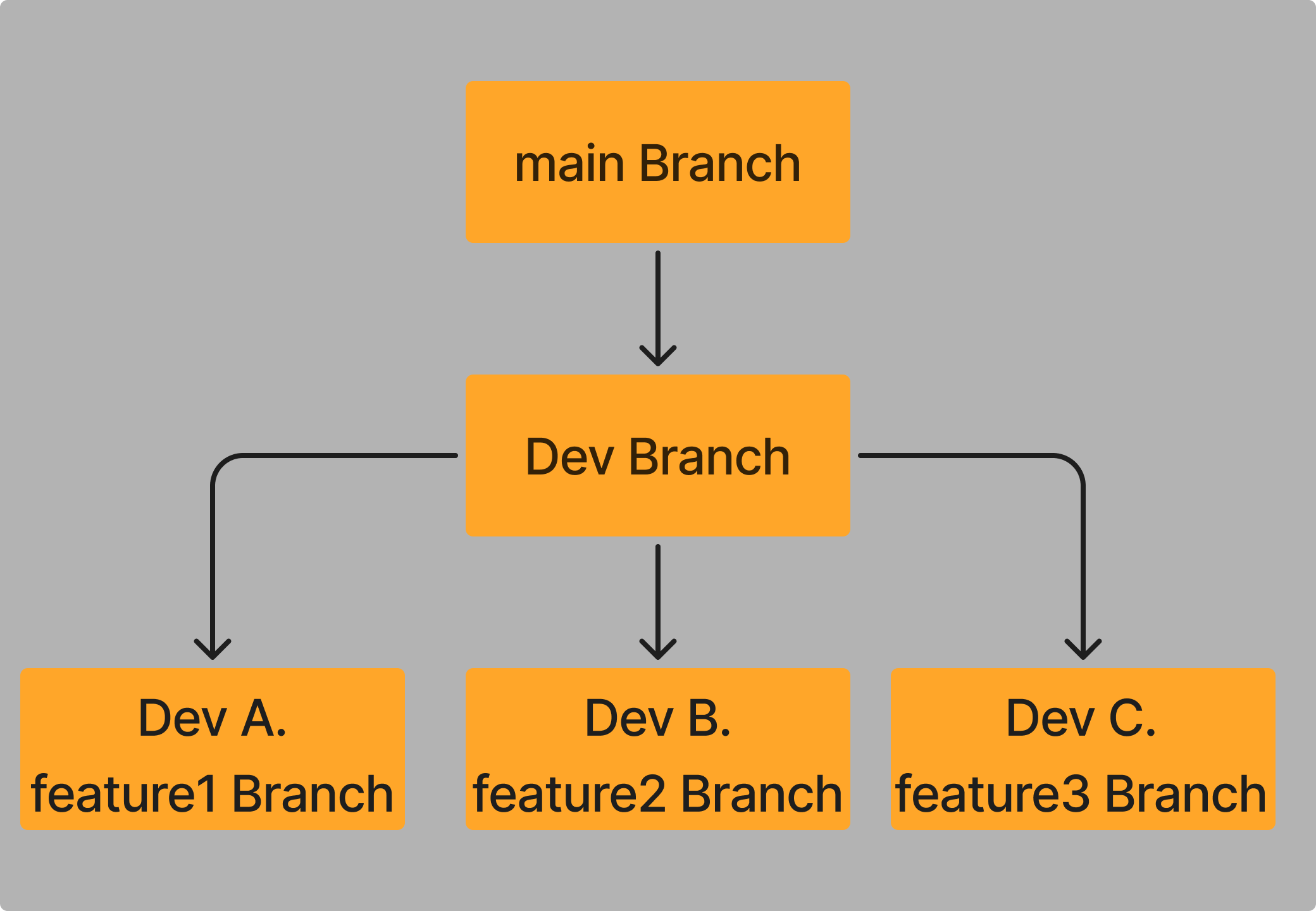 원격 저장소 내에 main, Dev Branch를 생성하고 Dev A, B, C 각자의 로컬 저장소에 복제한 후 자신이 작업할 feature Branch를 생성한다. 이후 원격 저장소에 각자 feature Branch를 publish한다.