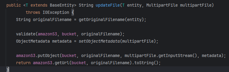 하지만 팀 프로젝트인만큼 파일 업로드가 필요한 도메인이 여러 곳이 있어서 따로 클래스로 빼서 사용 가능하도록 만들어야겠다고 생각했다.