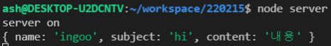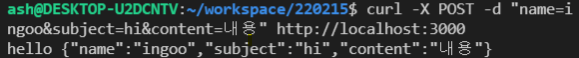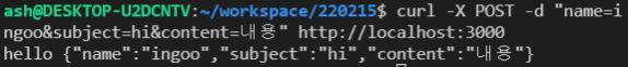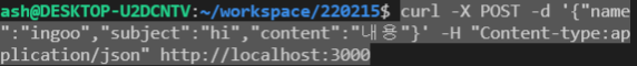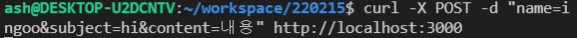curl -X POST -d "name=ingoo&subject=hi&content=내용" http://localhost:3000