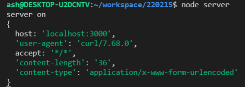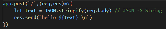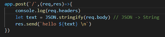 이제 여기서 JSON.stringify(req.body) 를 사용해서 curl -x -d로 요청을 해보면 데이터 타입을 객체에서 string으로 변경된것을 확인할 수 있습니다.
