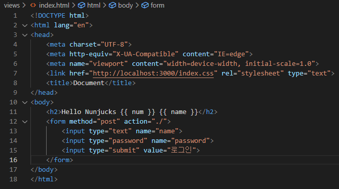 1. 같은 html파일에 form태그안에 있는 method값만 post로 변경하고 post 요청을 처리하는 라우터를 만들었다.