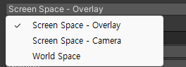 여기서 Render Mode를 보시면 오버레이, 카메라, 월드 스페이스 3가지가 있습니다.