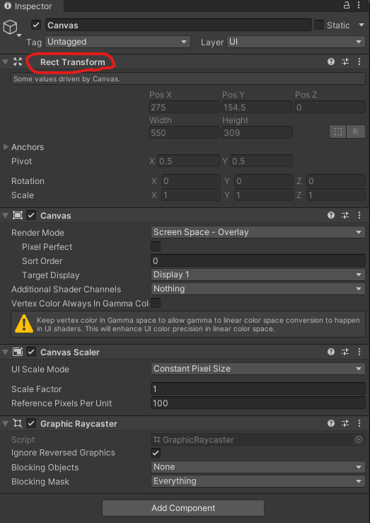 Canvas와 모든 UI는 일반 3D 오브젝트와는 다르게 UI를 화면에 표기하기 위한 2차원 사각형 내의 위치를 제어하기 위한 Rect Transform 컴포넌트가 포함되어 있습니다.