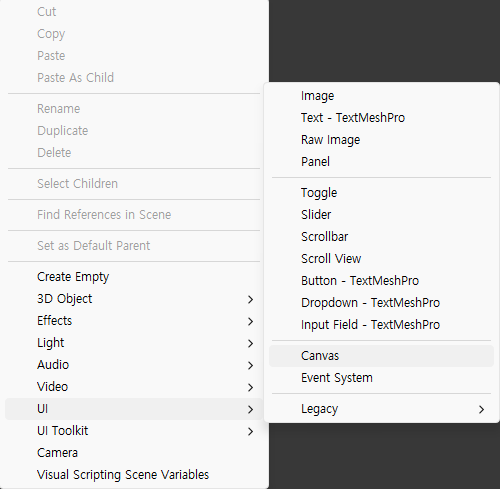 UI는 반드시 Canvas라는 오브젝트에 포함되어 있어야 하며