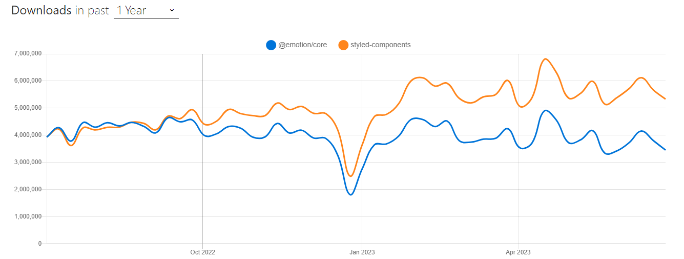 styled-components 와 emotion 을 보면 둘다 제공하는 기능이 거의 비슷하다 때문에 둘중 어느것을 사용해도 손쉽게 다른쪽을 이용할수있다. 그렇다면 트렌드를 비교해보자. styled-component 의 다운로드 수가 emotion 보다 훨씬높다. 다른것보다 스탯 창을 보면 최근 업데이트를 보면 emotion은 3년전, styled-componet는 14시간전이다,때문에 styled-componet 가 지속적으로 해당 라이브러리를 관리하고 있다고 생각되기에 나는 styled-component 를 프로젝트에 사용할 계획이다.