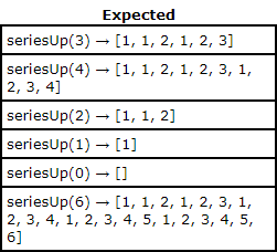 seriesUp(4) → 1, 1, 2, 1, 2, 3, 1, 2, 3, 4