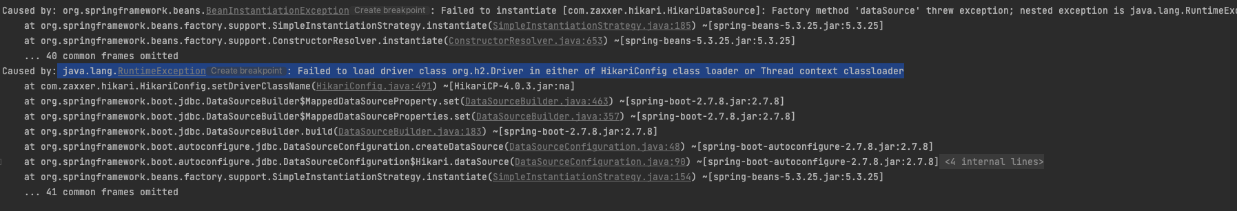 Failed to load driver class org.h2.Driver 라고 했으니까 h2의 의존성 주입 문제인 것 같다. build.gradle 파일에 가서 디펜던시 잘 되어있는지 확인해보자.