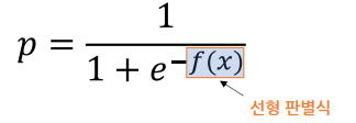 x 데이터가 주어졌을 때 확률을 예측하는 로지스틱 회귀 분석은 학습 데이터를 잘 설명하는 선형 판별식 f(x)의 기울기(a)와 절편(b)를 찾는 문제