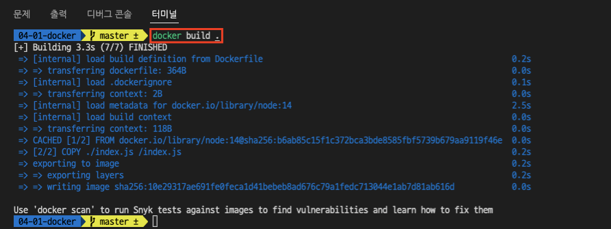 1. docker build .온점도 포함한 명령어를 통해 빌드한다. 빌드가 완료되면 이미지가 생성된다.