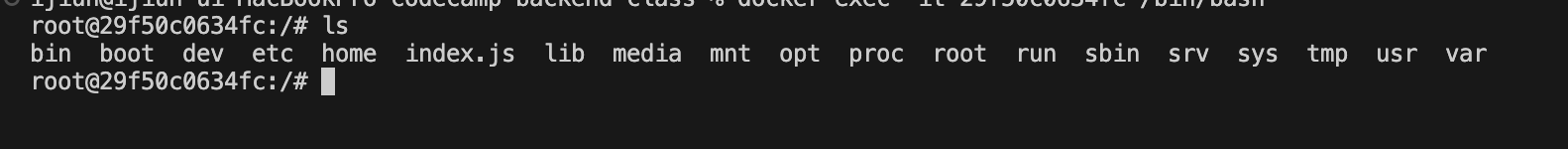 터미널 창에서 docker 컴퓨터 내부를 조작할 수 있게 된다.