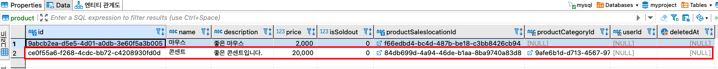 findOne을 통해 productCategory 테이블 객체를 찾아서 특정 변수에 담아주고 그 변수를 상품데이터 저장 시 productCategory에 저장을 시켜줘야 가능하다.DBeaver를 통해 확인해보면 상품 데이터에 카데고리 ID까지 함께 저장되어 있는 것을 확인할 수 있다.