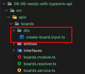 08-05-nestjs-with-typeom-api → src → apis → boards → dto 폴더를 생성한다. 그리고 create-board.input.ts 파일을 만들어 진행한다.